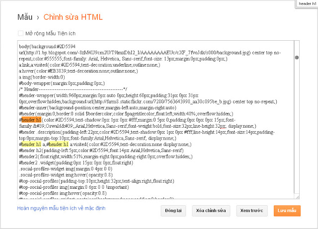 Vào phần chỉnh sửa HTML trong mẫu, tìm đến dòng có chứa "header h1" (bằng cách dùng ctrl + F)